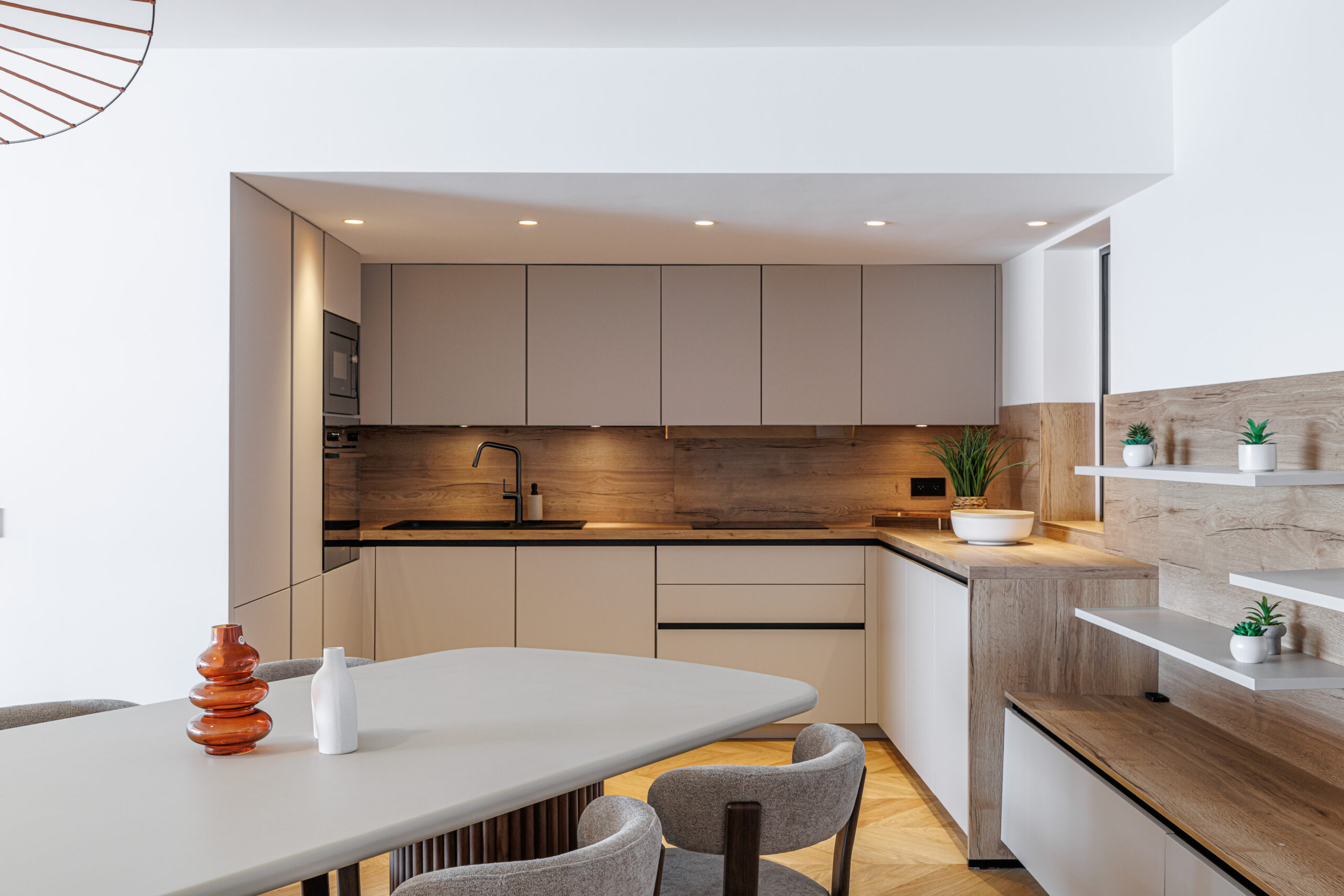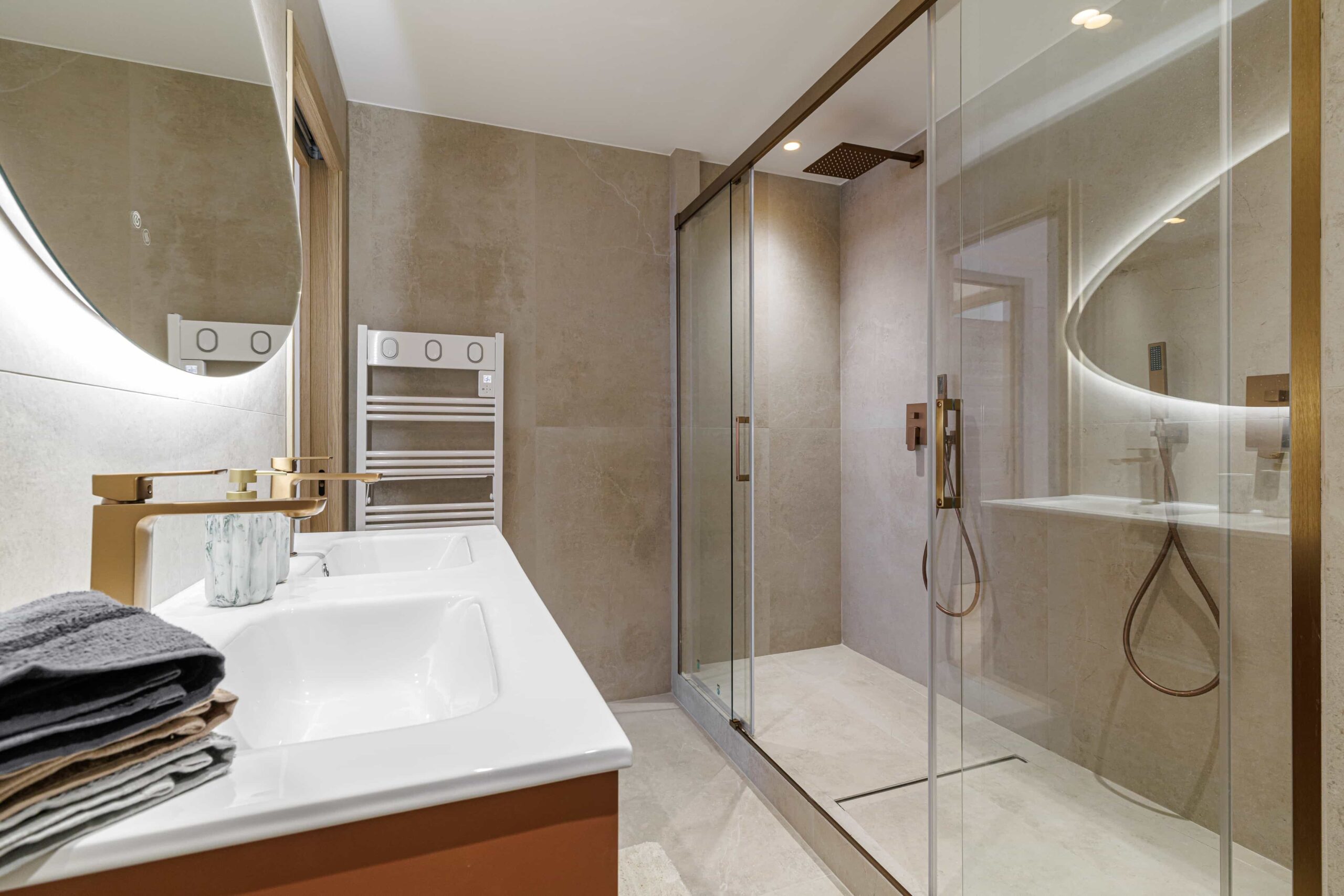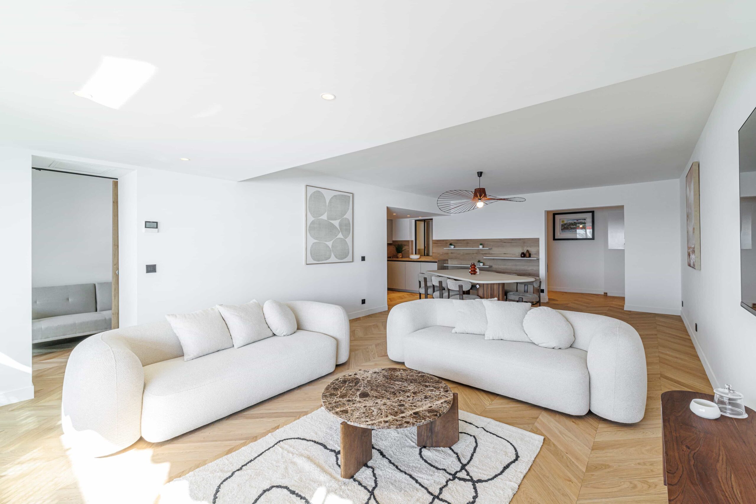 Traversant, le séjour s’ouvre sur une terrasse exposée sud offrant une vue panoramique sur la baie des anges.